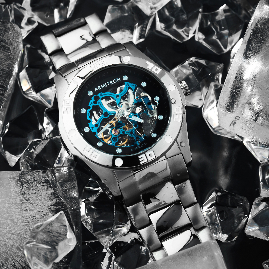 Getting a classic silver, leather, or gold watch from Armitron's collection of men's dress watches will ensure you look sharp and polished on those big nights out. The Skeletonâ„¢ 43mm Gold is an example of a standout choice for formal occasions. With its gold-tone case and exposed skeleton dial, this watch creates a sophisticated, eye-catching design that's perfect for elevating any formal attire with a touch of elegance and refinement.