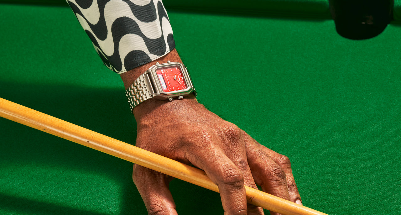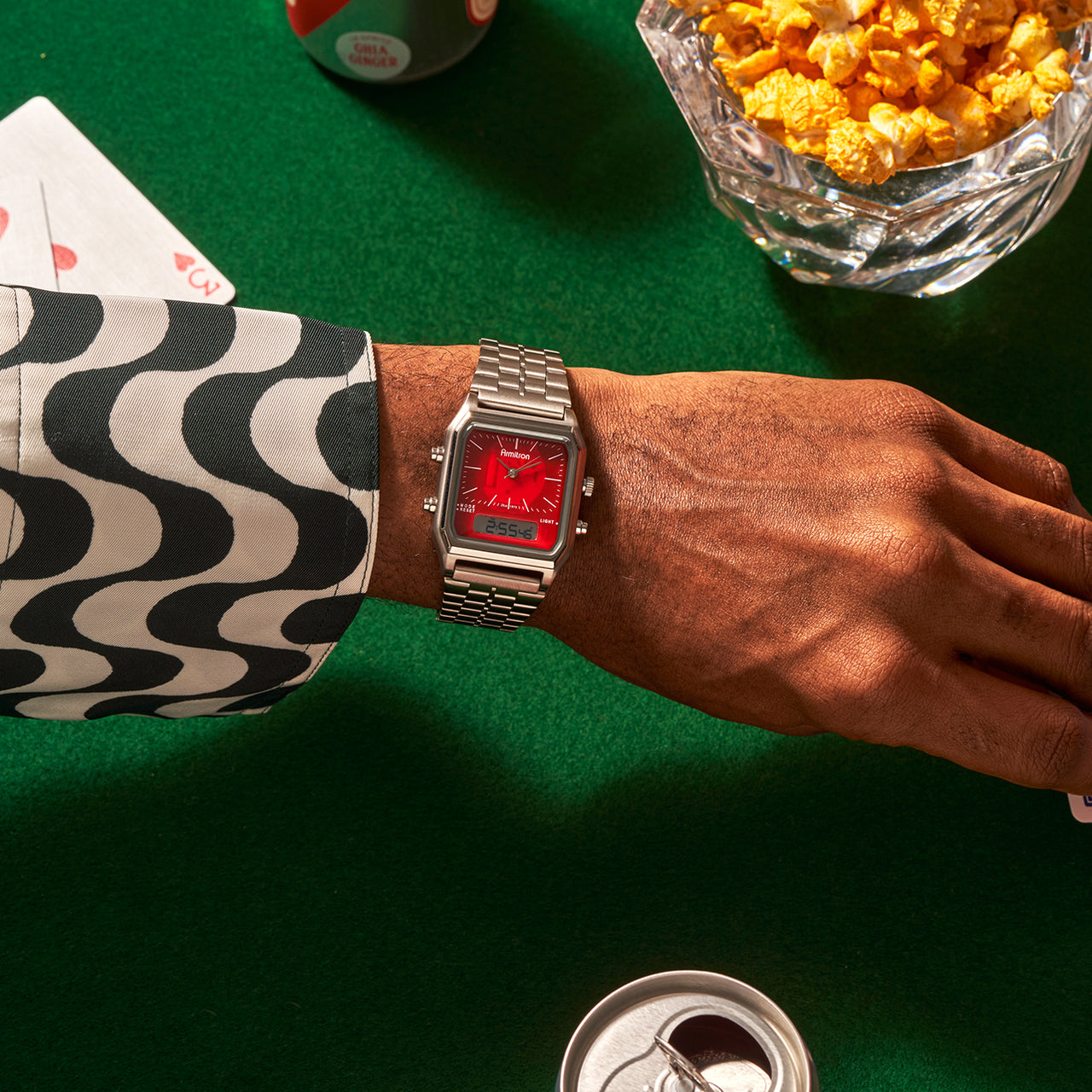 Tetra is funky reimagination of Armitron's original LED digital watch. The vintage-inspired oblong case design is finished with a silver-plated polish. The flashing digital display waits in sleek black sleep mode until activated by pressing the side button. Strap on this retro minimalist style and wear a piece of fashion history.
