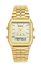 The Ridgemont combines sophistication with modern functionality, featuring a sleek silver stainless steel bracelet and a distinctive watch face. It is equipped with EL technology—where the digital panel illuminates with a soft glow, ensuring easy readability in any lighting conditions. Its ana-digi movement seamlessly integrates analog and digital components, offering precision and versatility. The square case shape adds a contemporary edge to the design, complementing the striking navy dial. With a day and date calendar function and index markers in the form of sticks, the Ridgemont watch is a stylish and practical accessory for those who appreciate a harmonious blend of form and function.