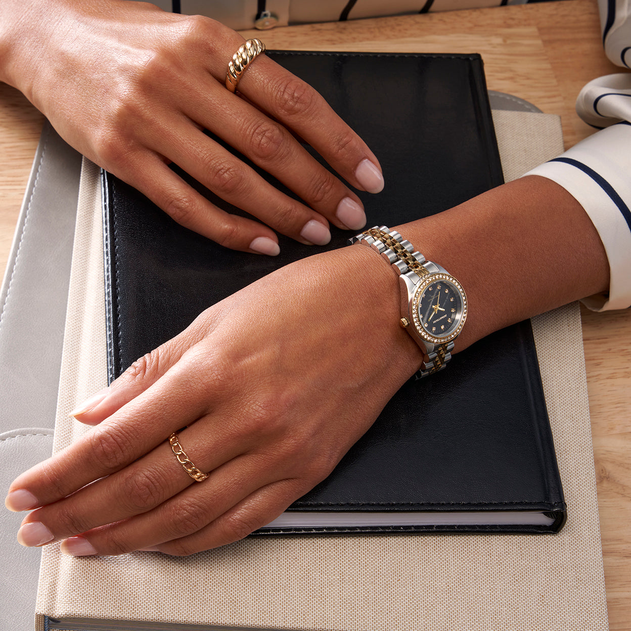 Accented with precision-set crystals for maximum brilliance and enduring elegance.