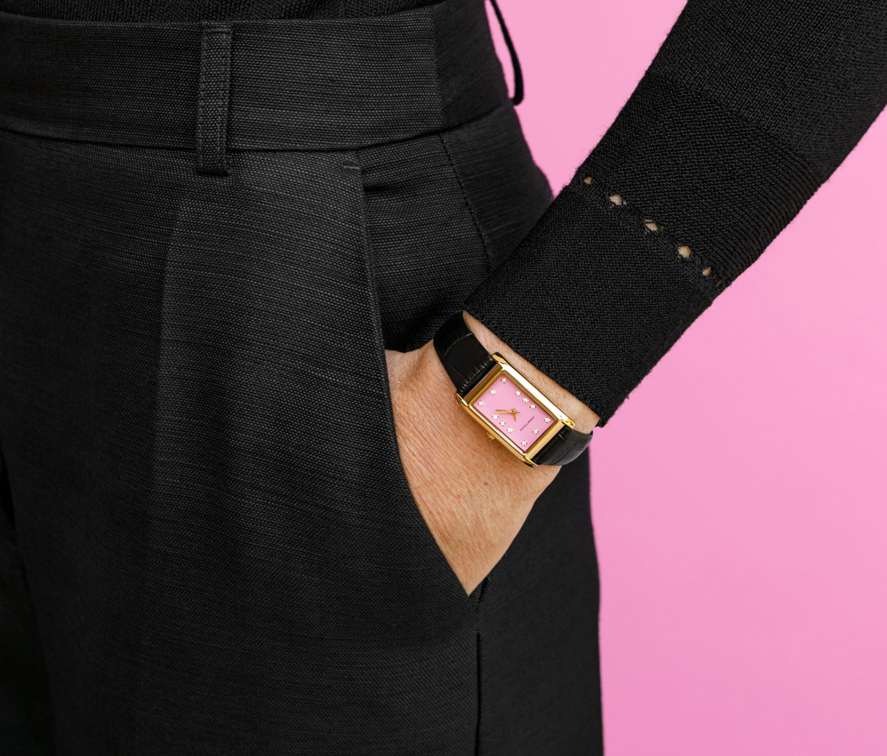 The Tessa Together In Pink Collection brings a touch of elegance to your everyday look with its pink dials and subtle crystal sparkle. Framed in a warm gold tone and a classic black leather croco-pattern band for a refined feel. It’s the perfect way to add a little shine to any day.